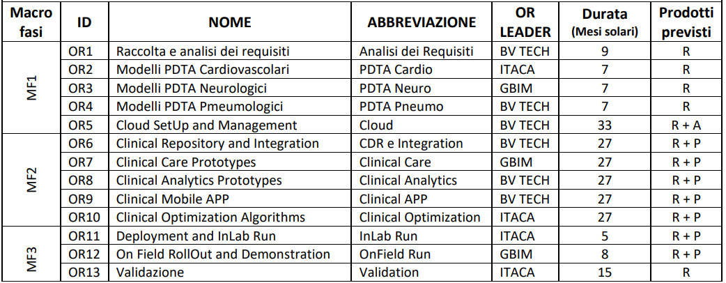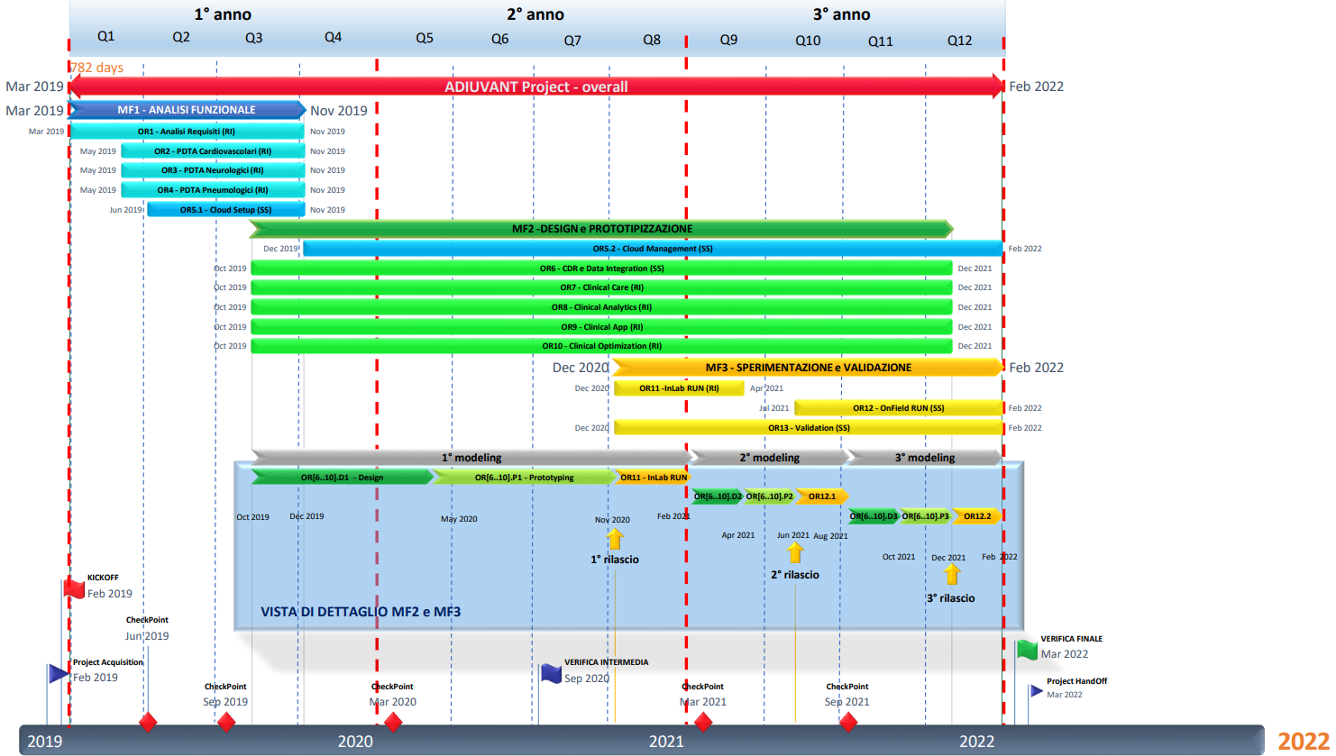 Terminata la MF1 vengono avviate le attività della MF2 Disegno e Realizzazione di tutti i Prototipi previsti, inclusi Clinical Analytics e Optimization, e viene anche avviata l’attività di Gestione delle infrastrutture ICT in Cloud. Completata la realizzazione del 1° prototipo, in parallelo ad MF2 ha inizio anche la Macrofase MF3 Sperimentazione e Validazione attiva sino al termine della durata complessiva del progetto.